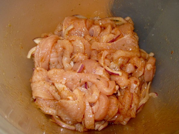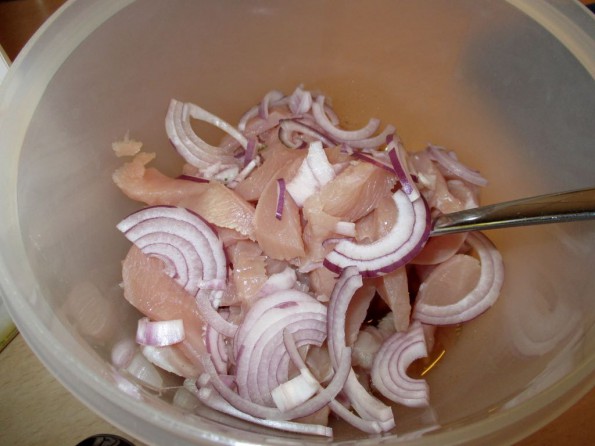 - Schneidet das Putenbrustfilet in ca. 1,5cm breite Scheiben und diese in ebenso breite Streifen. Gebt die Fleischstreifen in eine Schüssel.