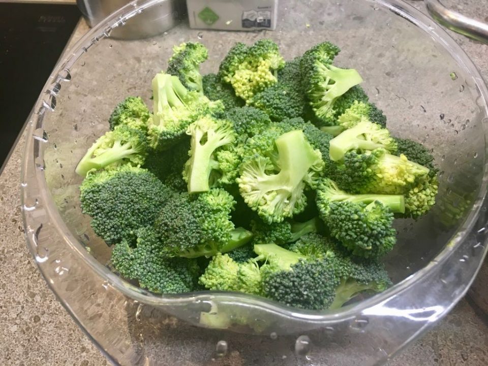 - Schneidet erstmal die Brokkoliröschen vom Hauptstrunk und gebt sie in eine Schüssel mit kaltem Wasser. Teilt die großen Röschen, indem ihr von unten vom Strunk ausgehend mit einem Schnitt viertelt oder halbiert. Sie sollten nachher so groß sein, dass man sie ohne weiteres Schneiden essen kann. Lasst sie in einem Sieb abtropfen.