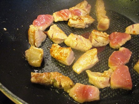 • Die Filetwürfel gebt ihr in die Eiweiß-Soja-Mischung und rührt sie einmal gut um, so dass alle Würfel bedeckt sind. Die Mischung sorgt hinterher dafür, dass die Würfel beim Anbraten eine schöne Farbe bekommen.