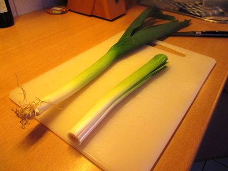 • Vom Lauch schneidet ihr den Wurzelansatz und einen Großteil des dunkelgrünen (harten) Teils ab, schlitzt den Rest einmal der Länge nach auf und entfernt die äußeren zwei Blätter. Wascht den verbliebenen Rest unter fließendem Wasser. Am besten geht das, wenn man den Lauch an der Stelle, wo man ihn eingeschnitten hat, auseinanderdrückt. Danach drückt ihr das überschüssige Wasser etwas heraus und schneidet die Lauchstangen schräg in ca. 3 cm lange Stücke.