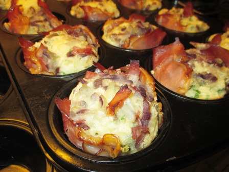 - Wenn die Muffins fertig sind, holt die Bleche aus dem Ofen, lasst die Muffins ein paar Minuten auskühlen und holt sie dann aus den Förmchen. (Man kann sie gut am Schinken anheben...)